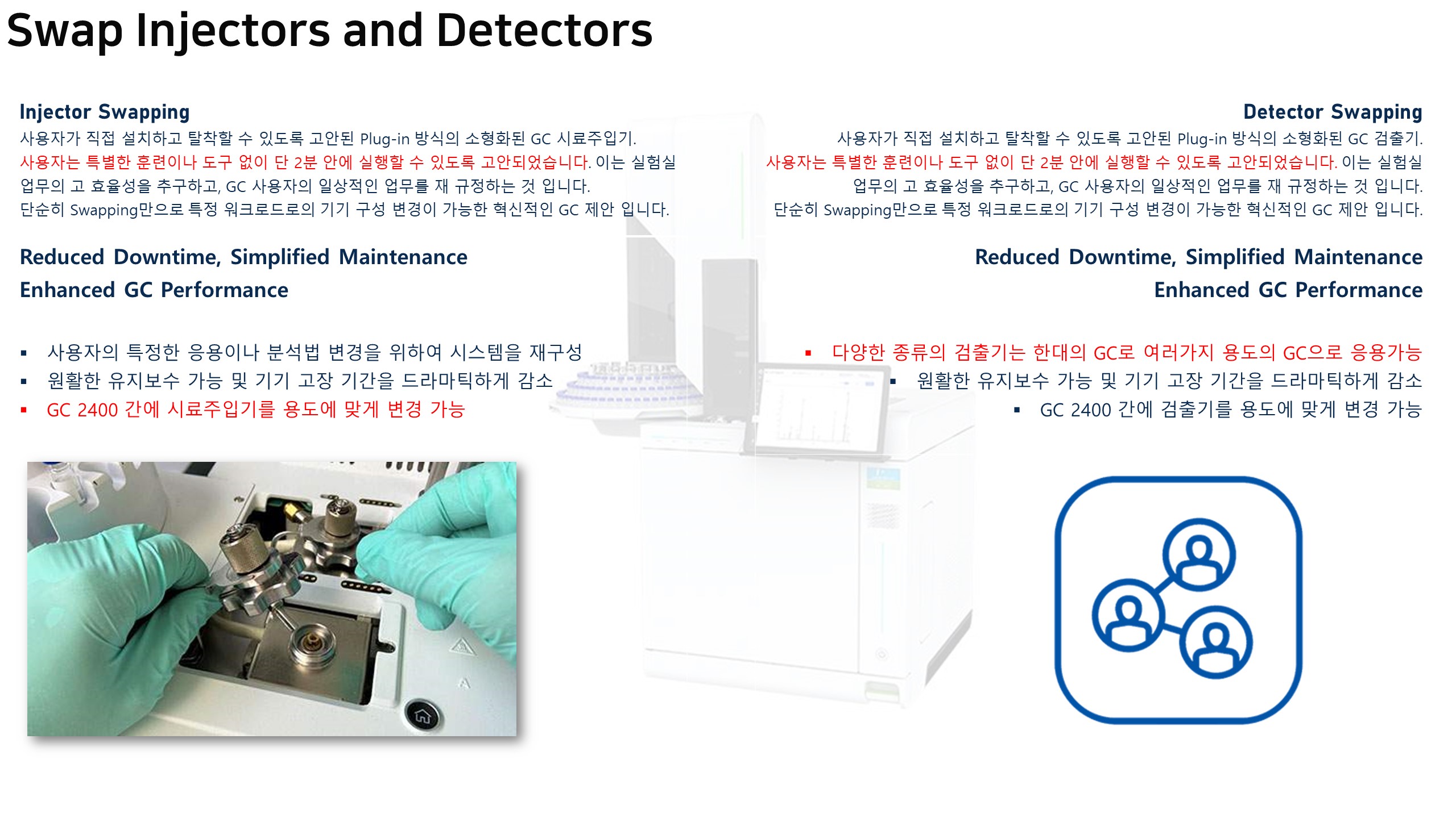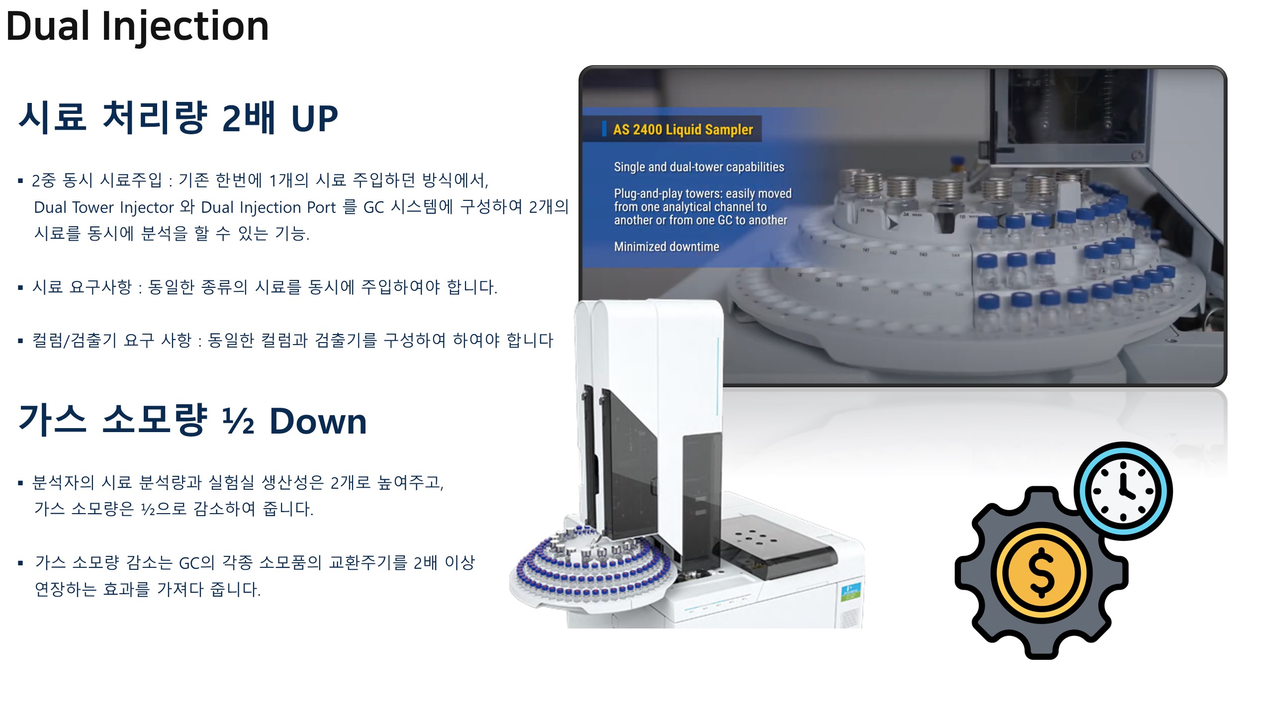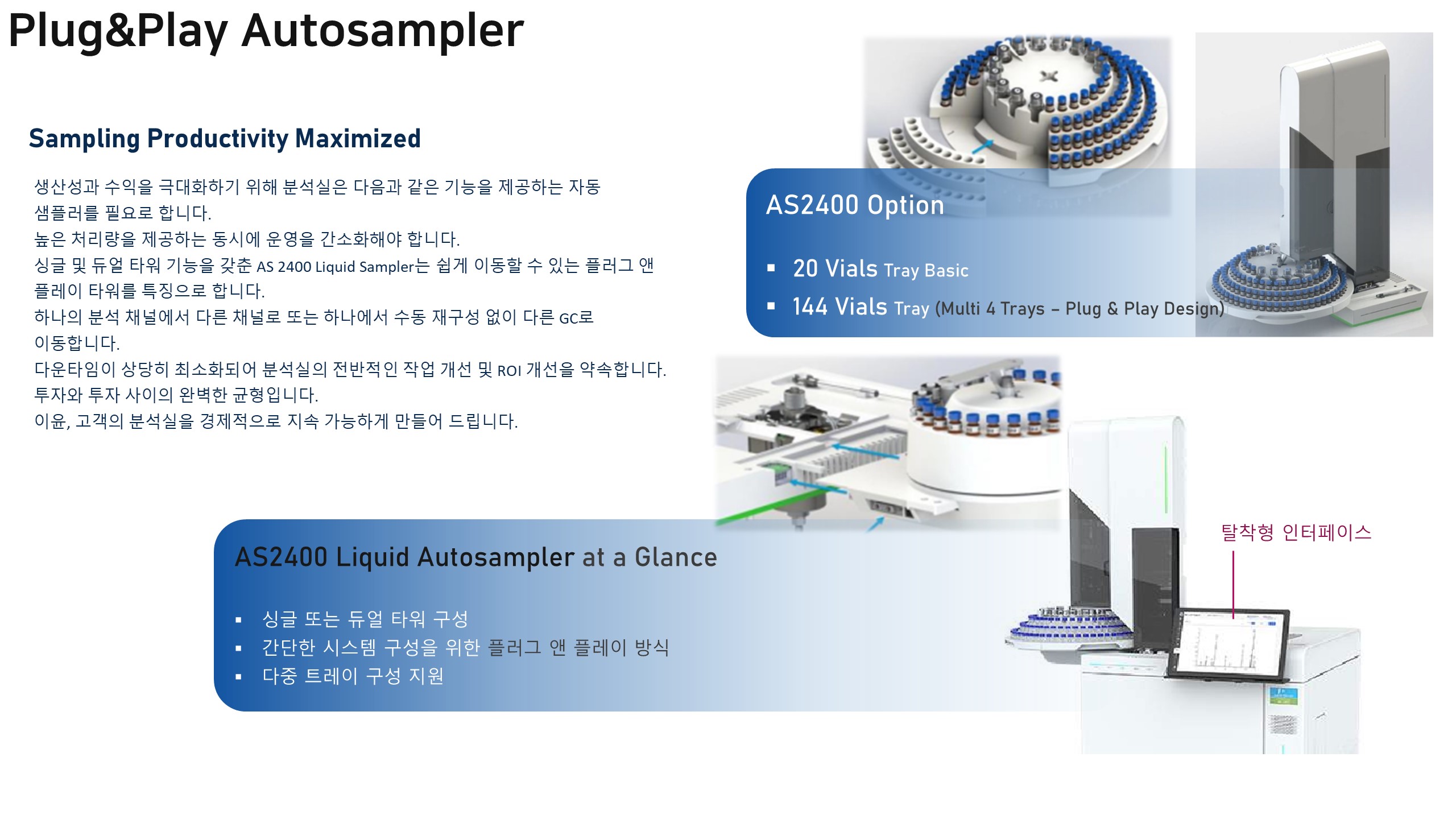 - 4채널 트레이 : 플러그 앤 플레이 방식의 액체 자동시료 주입기는 최대 4개까지의 트레이 제공으로 4명의 사용자가 1대의 GC으로 연속 분석이 가능.