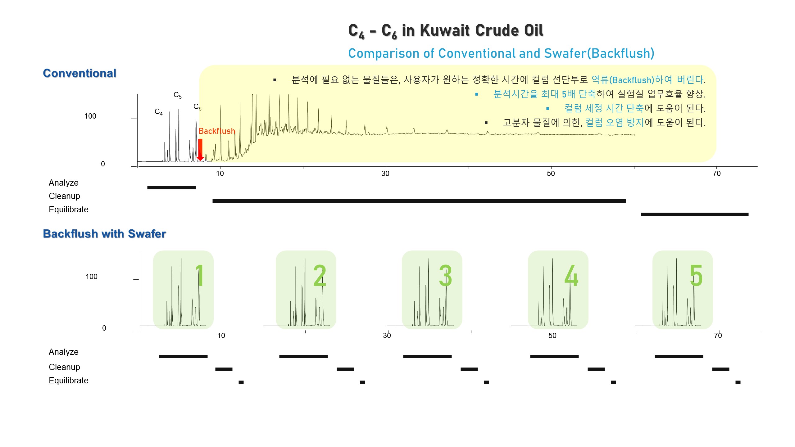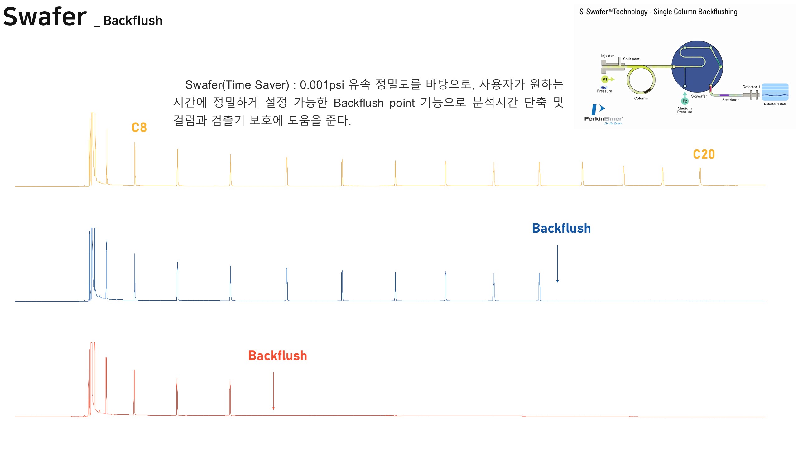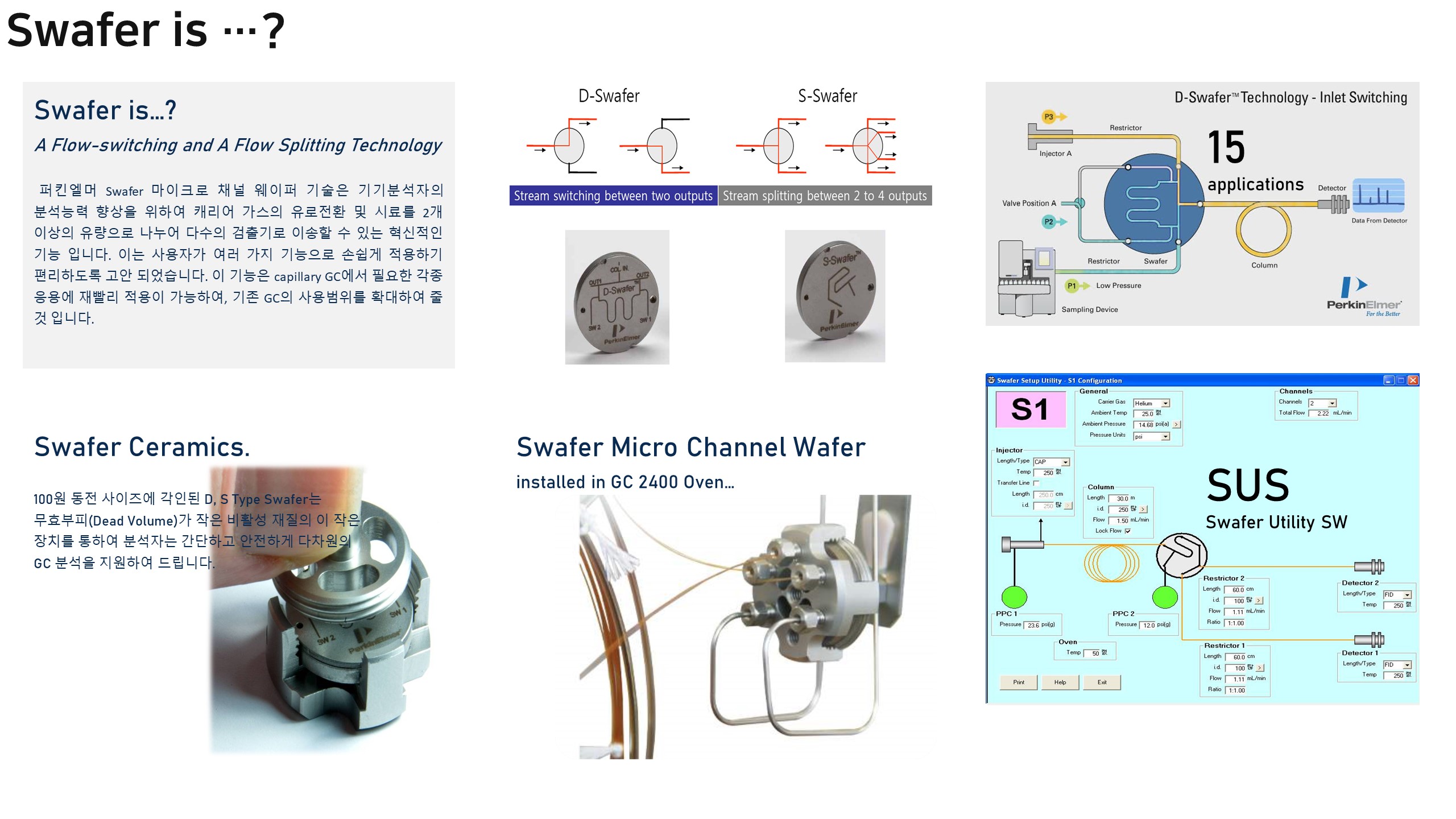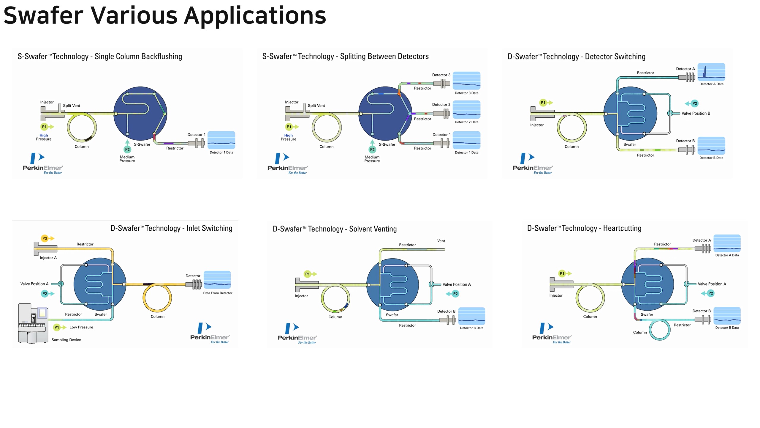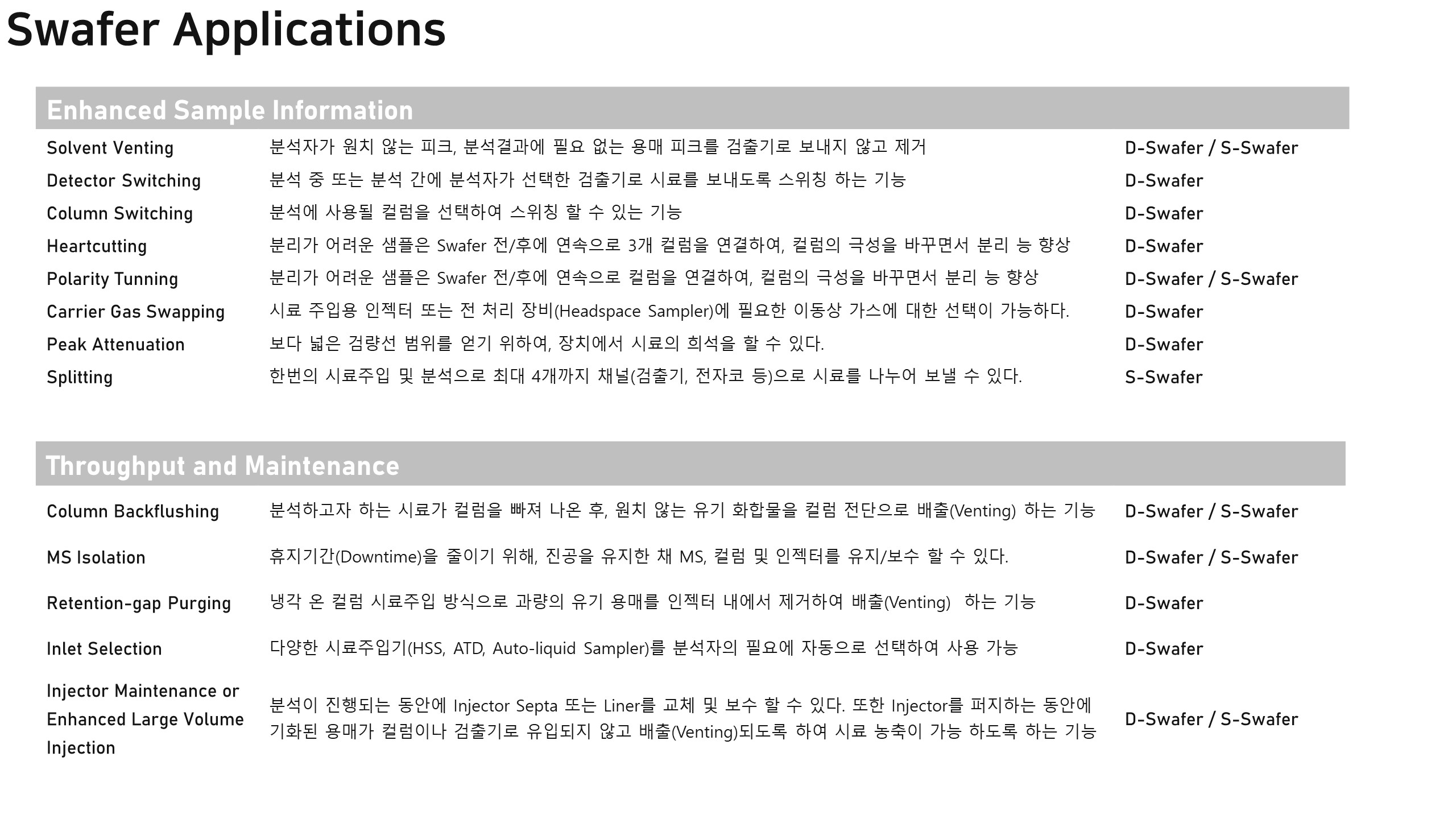 - Swafer Micro-Channel Switching : 미세 유량 스위치 기능으로 Column Backflushing으로 포함한 15가지의 다양한 분석자 편의 기능을 제공