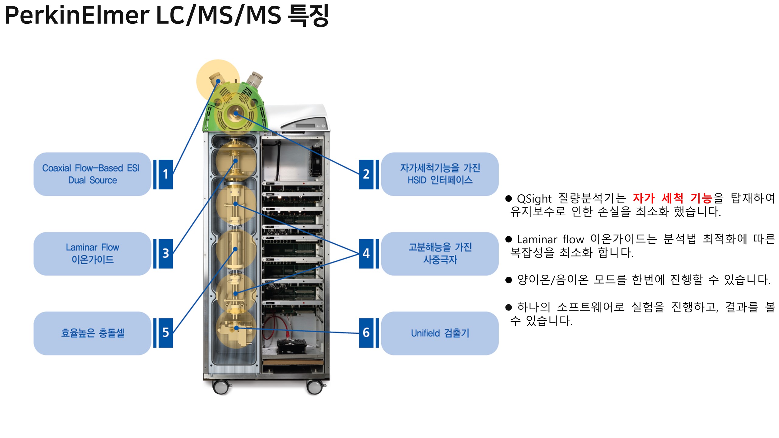 QSight LCMSMS System 제품특징 Coaxial Flow-Based ESI Dual Source 자가세척 기능을 가진 HSID 인터페이스 채택으로 유지보수 시간을 최소화 하였습니다. Laminar Flow 이온가이드 시스템에서 분석법 최적화에 따른 복합성을 최소화 합니다. 고분해능을 가진 사중 극자 질량 필터 시스템 고 효율의 충돌 셀 Unifield 검출기 양이온/음이온 모드를 한번에 실행할 수 있습니다. 설명 설명